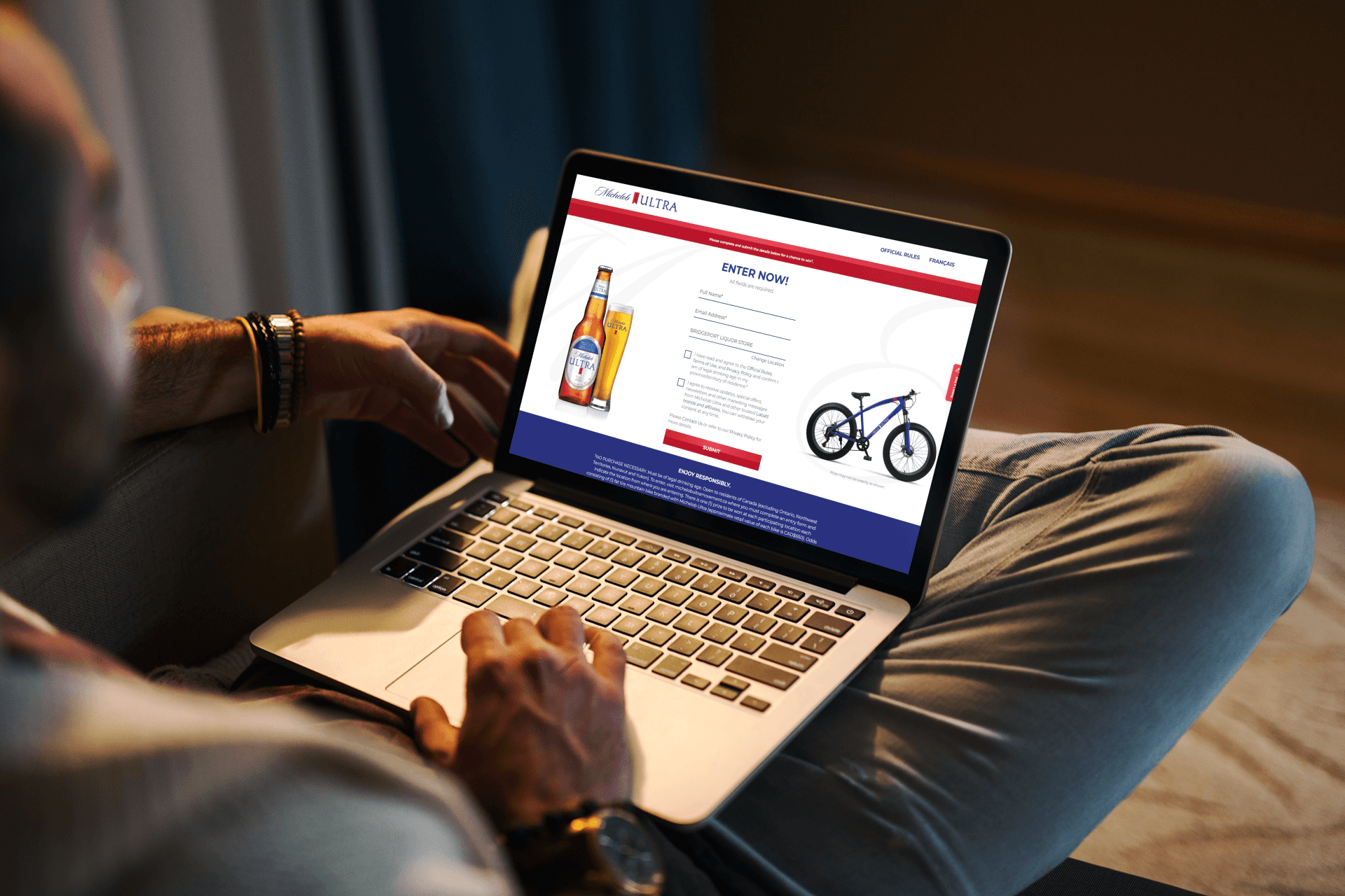 A contest site that allows users to enter a draw to win prizes from Michelob Ultra.